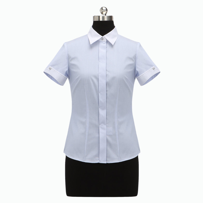 重庆女短袖正规领蓝色仿丝绸衬衫